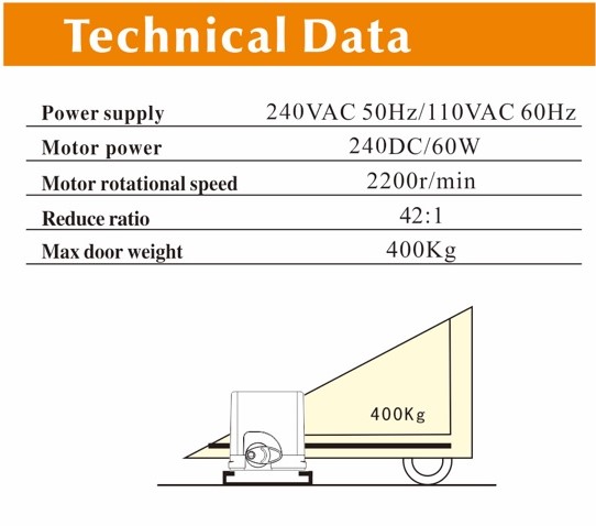 - 60W DC Motor: Efficient motor with a high rotational speed of 2200 RPM and a 42:1 reduction ratio for smooth gate movement.